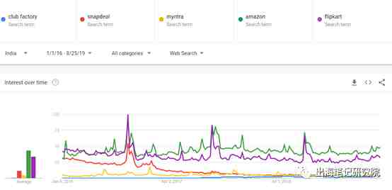 通过上面的品牌热度曲线图对比发现,尽管 Club Factory 已成为目前众多出海印度的电商企业中的佼佼者(船长写这篇文章的时候, Club Factory已经在国内媒体披露 1 亿美元 D 轮融资),相比本土的强大对手 Snapdeal 和 Myntra 差距并不大,但与深耕多年的国际巨头Amazon,以及本地老牌劲旅 Flipkart 相比仍有不少差距。
