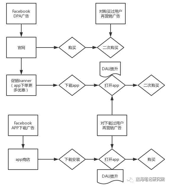 Step3: 对已购用户投放再营销广告,产生二次购买;对下载过 App 的用户投放带有提示“用 App 打开”(deeplink)的广告,产生二次购买,并提高活跃度DAU;