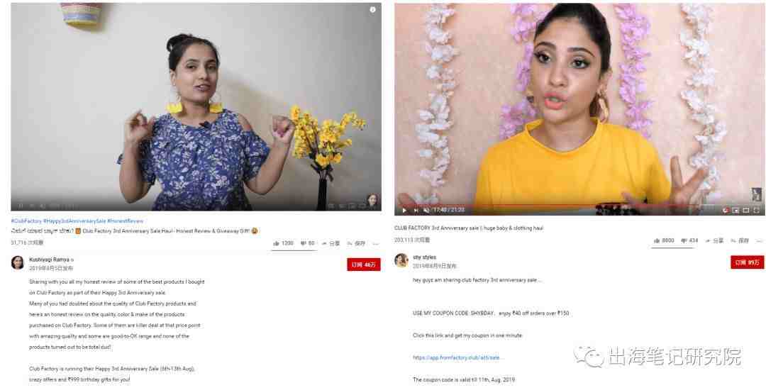 ① Youtube网红:8月5日拥有46万粉的Kushiyagi Ramya 和8月9日拥有88万粉的 shy styles,她们为 Club Factory 宣传3周年促销活动的发帖,引起了两波非常高的热度。