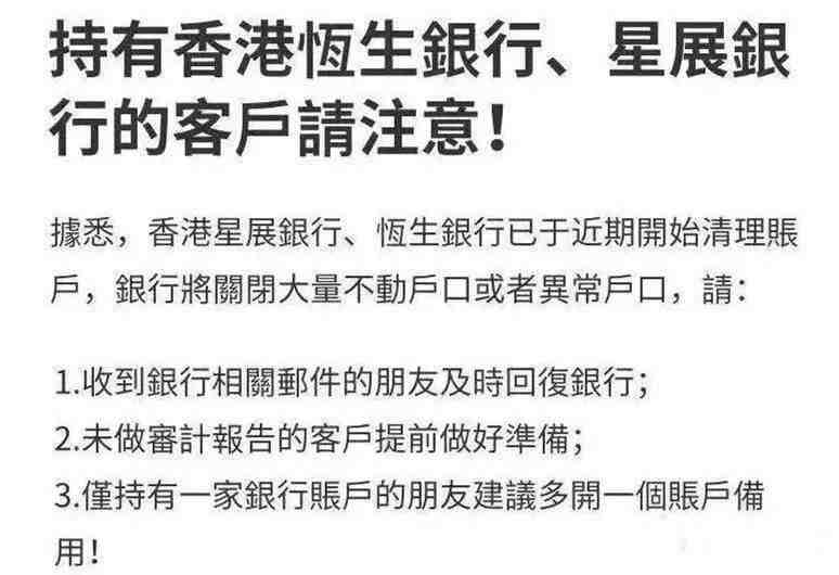 确实,在近几年全球反避税、反洗钱的大形势下,香港许多银行都开始对离岸账户进行清理。据公布信息,从2009年到今年,全球离岸账户的数目下降了34%,CRS金融账户涉税信息交换的实施是大批账户被封停的主要原因,仅是去年,恒生银行清理/关停的离岸账户就超过1万个。在这种形势下,11月底前发生大规模离岸账户清退事件,也是极有可能发生的。