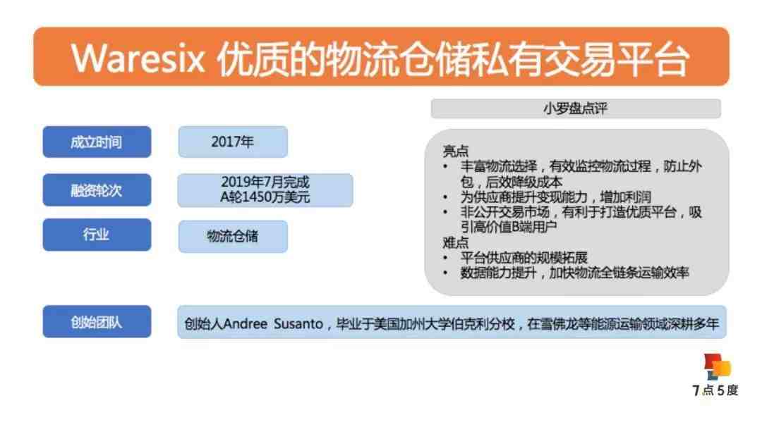 小罗盘今天向大家介绍的是Waresix, 一家物流仓储交易平台,他们服务B端客户品牌商,共建物流联盟,规范物流服务流程,打造优质平台,提供数字化物流的解决方案。