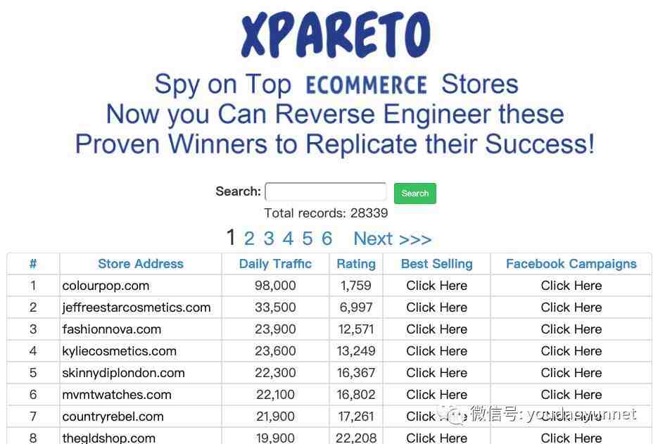 Xpareto 网站可以根据关键词搜索排名靠前的Shopify店铺,并展示店铺的日流量、热销品和Facebook广告。