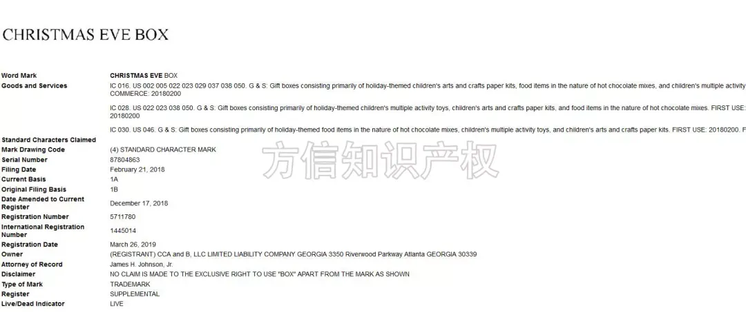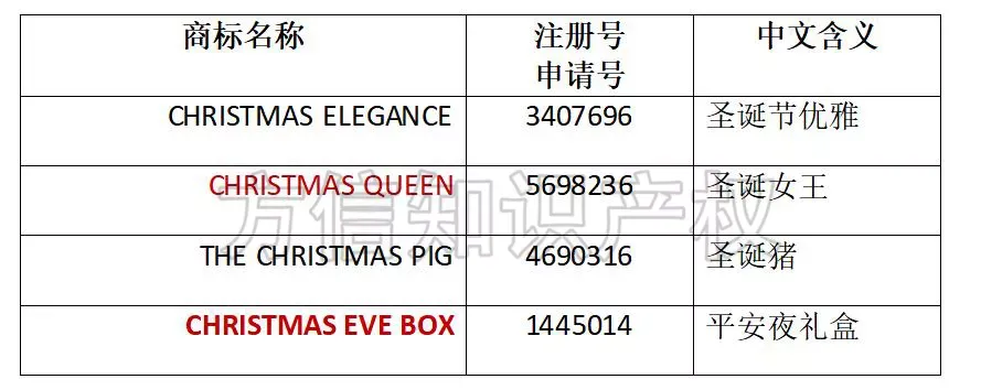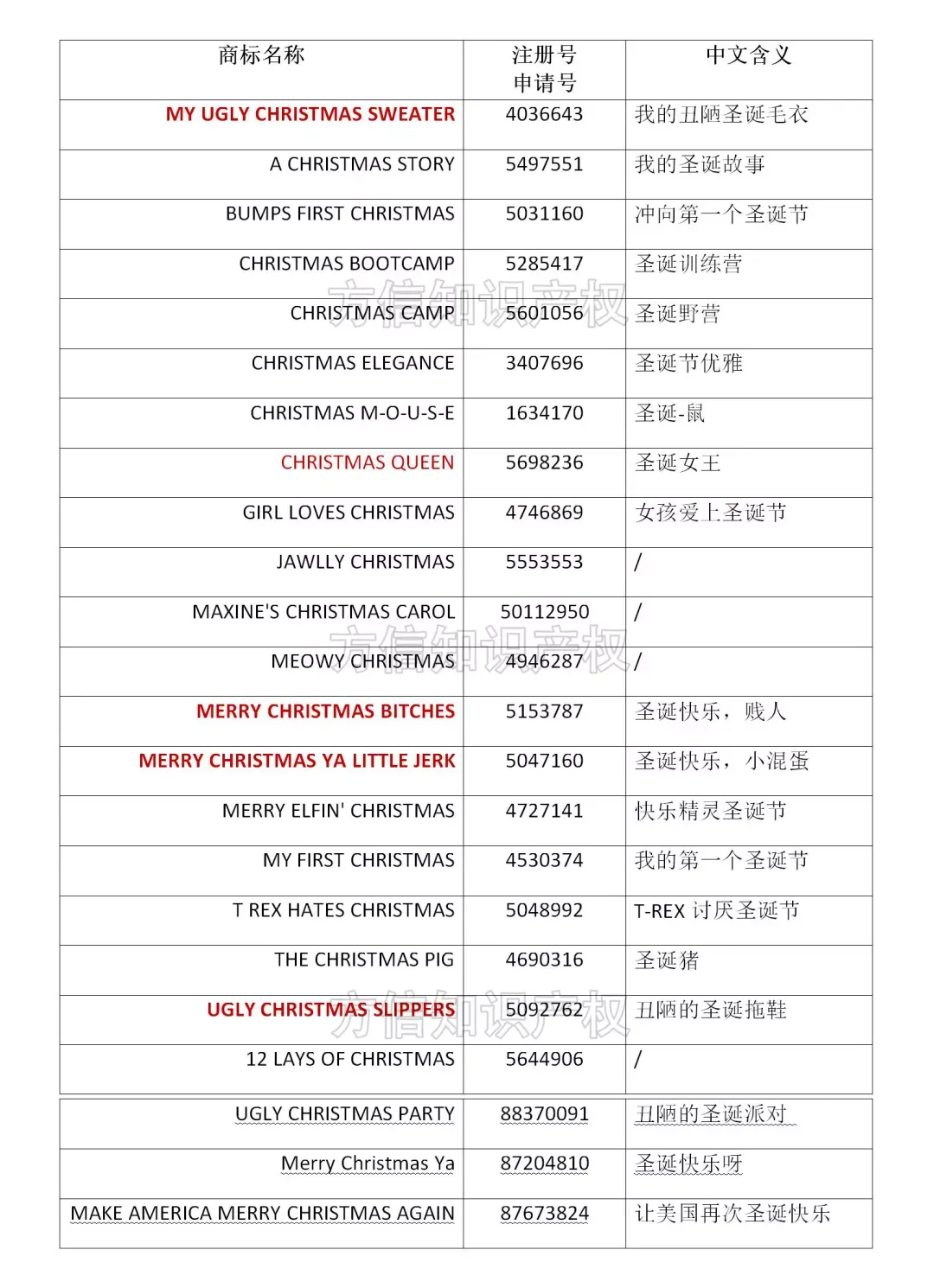 2019年的圣诞节也快到了,随着节日的临近,电商卖家们都开始相继上架圣诞节的产品, 而服饰和玩具便是圣诞节中的热销品类。 今日,方信小编整理了关于“圣诞节 CHRISTMAS”一词在服装和玩具两大品类上的商标注册情况,方便卖家们避开和圣诞节相关的商标侵权。 在圣诞节的时候,穿上一件带有节日用语的衣服参加party,那是十分应景的!所以,圣诞节标语,口号和俚语作为一种张扬个性的装饰元素被广泛应用在衣服,鞋袜,帽子和手套等产品上。 我们一起看看含有“圣诞节 CHRISTMAS”一词的服装品类相关的美国商标有哪些: 圣诞节的词汇在服装类别上获得注册的商标比较多,在玩具类别上,有效的商标不多。 不过,销售圣诞节礼盒的卖家需要特别注意其中一个商标, “CHRISTMAS EVE BOX”(平安夜礼盒) 这种词汇十分容易踩雷, 为了避免涉嫌侵权投诉,卖家们尽量避开使用此商标,可以用其他同义词描述相关的产品。 那么,含有“圣诞节 CHRISTMAS”一词的玩具品类相关的美国商标有哪些: 两大圣诞节热销品类的商标整理到这里,小编希望能够帮助到卖家们在圣诞节来临之际远离侵权雷区! © 本文系方信原创文章,部分图片来源于互联网,版权归原作所有 欢迎转载,转载请留言公众号联系小编添加白名单并注明来源