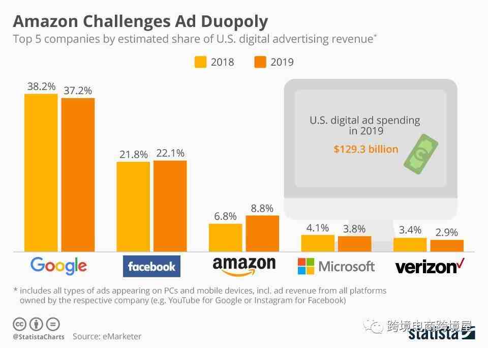 eMarketer预测,到2020年,亚马逊广告部门收入将占美国数字广告支出的10%,成为仅次于谷歌和Facebook的第三大广告巨头。