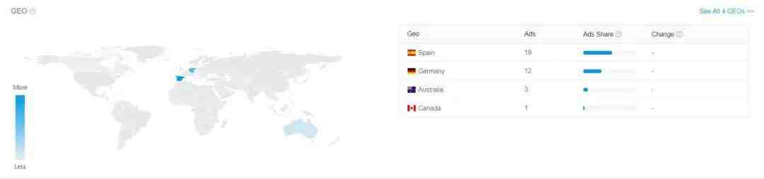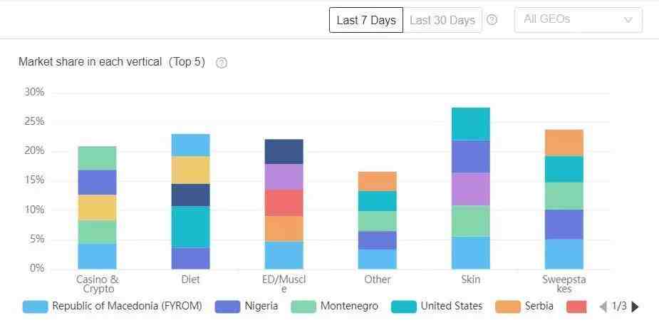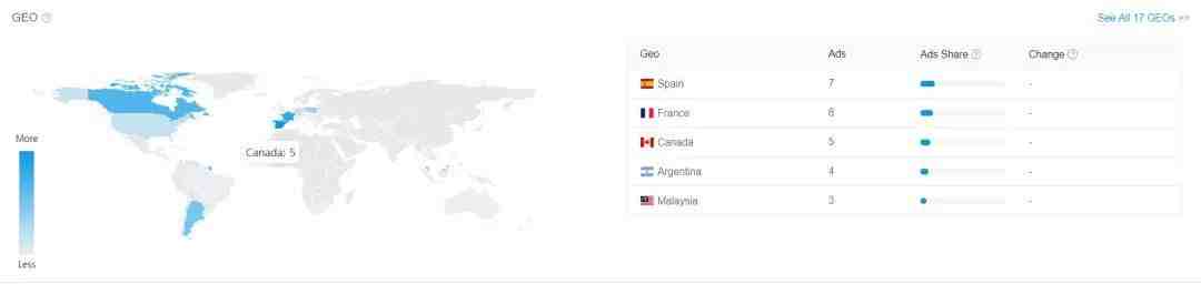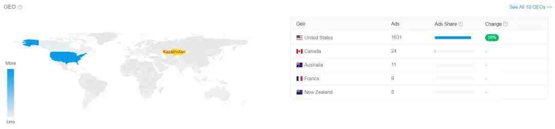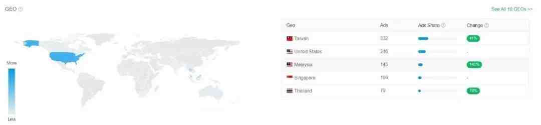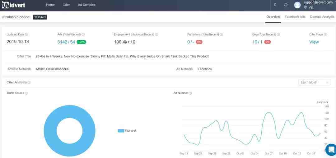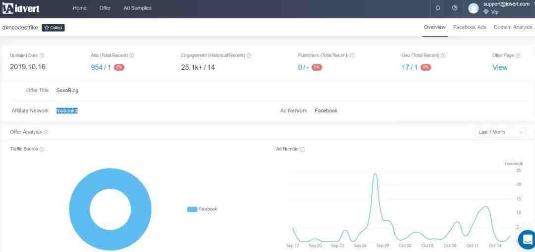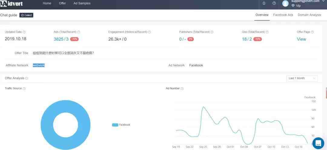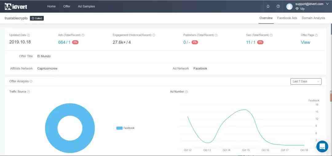 在idvert上有多个vertical(如减肥、护肤、成人、博彩、比特币等)的offer及其详细信息,比如它下面所有的广告素材和详情、投放国家、落地页、广告页等。我们既可以根据这些综合信息来判断是否是赚钱offer去跟跑,也可以学习同类offer的优秀创意。