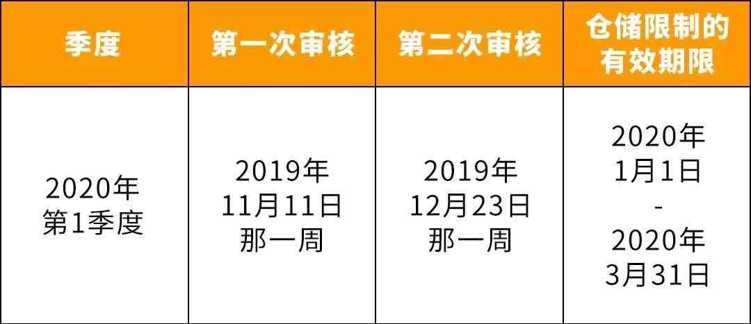举例说明:如果你的IPI分数在2019年11月11日那一周低于400,你将被告知你在2020年第一季度的潜在存储限制。你将有六周的时间来提高你的IPI得分。如果你的IPI分数在2019年12月23日那一周仍然低于400,那么在明年一季度你的存储仓容将被限制,超额库容将被收取费用。