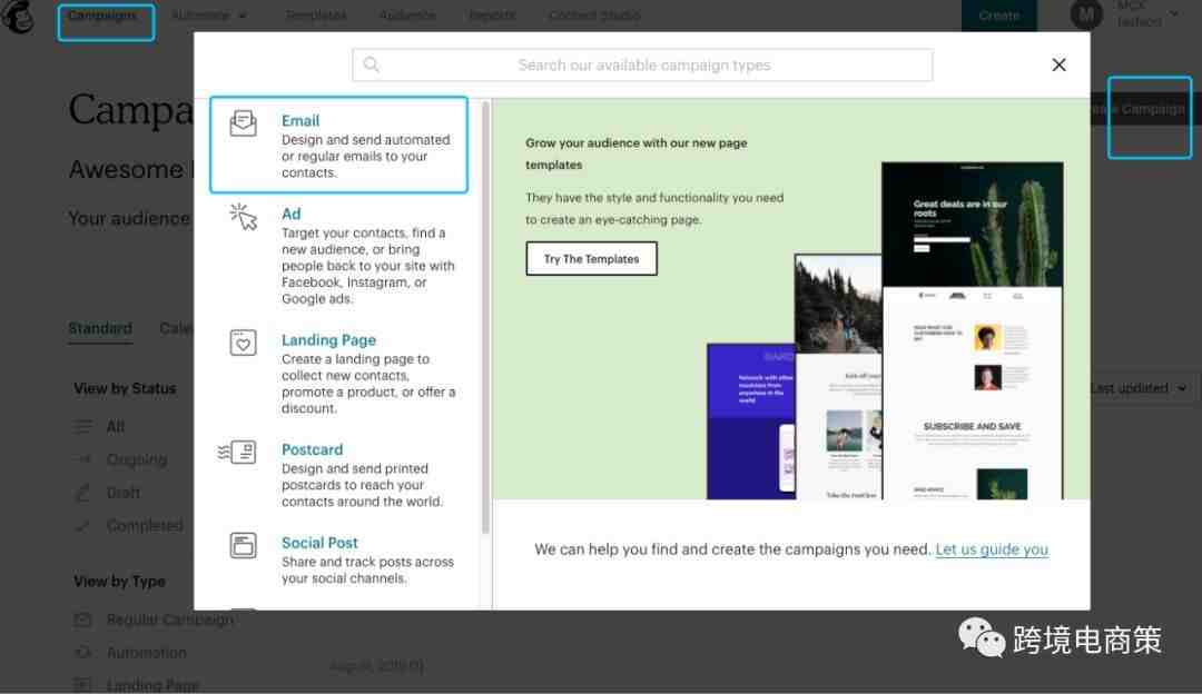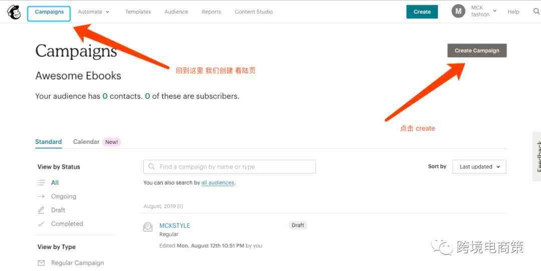 继续点击campaign 然后在点击create campaign 选择我第一个 email