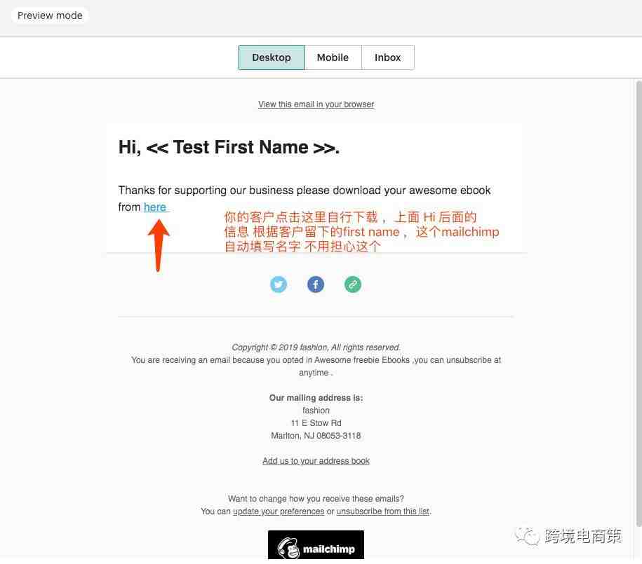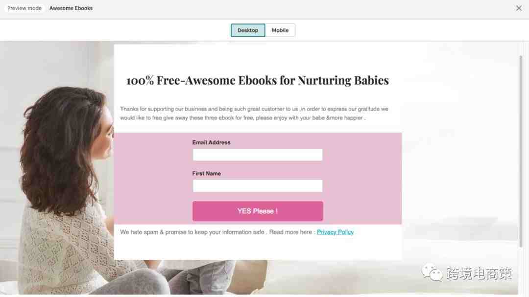 我吧这个过程已经做好了,这个非常简单如果你还是没有搞清楚如何制作可以观看我录制好的实操视频,获取方式关注公众号:【跨境电商策】输入获取【mailchimp 着陆页】下载视频,以下是我们做好简单的页面: