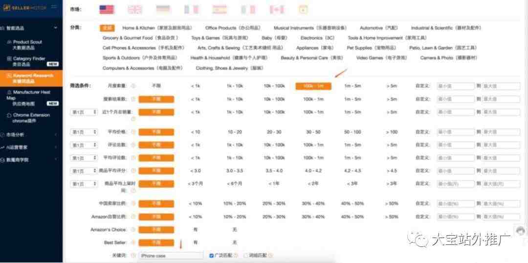 市面上就有很多这类工具,比如SellerMotor选品工具和运营工具,其中就嵌入了很多实用的小工具,就包括选词这一块。如上图显示的关键词选品,我们可以通过筛选搜索量比较高的词,输入自己产品对应的关键词,然后选择广泛匹配模式,就可以找到很多近期被买家搜索过的关键词,这时候再根据一个月的销量等等匹配条件,找到一些有意义的关键词。