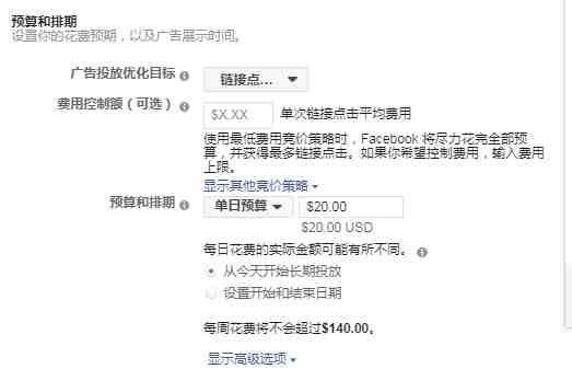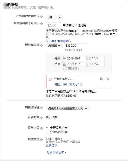 如果要设置广告投放时间,需要选择总预算。单日预算不允许安排广告。一旦广告发布后,将无法从单日预算更改为总预算。因此,如果你需要分日程或时段安排广告,就必须创建一个包含整个总预算的新广告系列。
