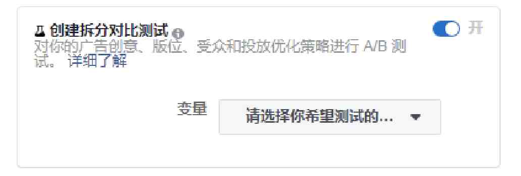 在广告系列创建步骤中,选择“创建拆分测试”,然后选择“广告素材”作为要测试的变量。