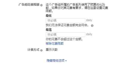 这将打开更多设置,第一个是“广告组支出限制”。单击蓝色的“向此广告集添加支出限制”文本,它将在下面打开编辑器: