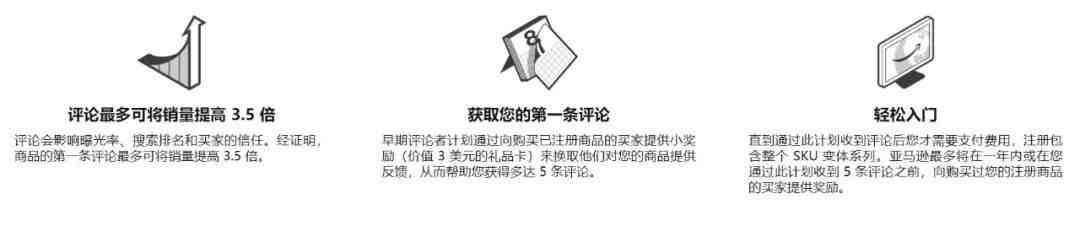 1、主要强调评论对销量提升的好处,当然前提都应该是好的评论,所以卖家在选择投放产品的时候要选择那些质量好、有潜力的产品。如果自己对产品质量都不自信,建议就不要选择创建该计划了,因为你有可能得到的是差评。