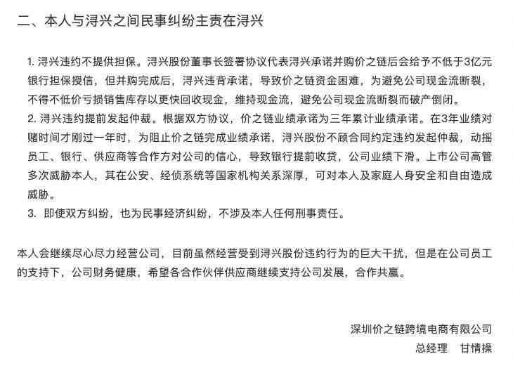在转让的同时,浔兴股份与甘情操夫妇签署了《盈利补偿协议》。按照约定,甘情操夫妇承诺2017年至2019年,价之链的净利润不低于1亿元、1.6亿元和2.5亿元。