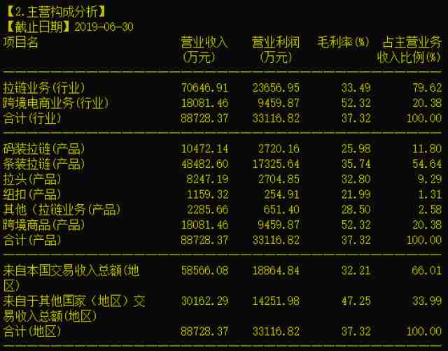 半年报显示,浔兴股份上半年总收入为8.87亿元,净利润4514.04万元,收入中的79.62%来自于拉链业务,跨境电商业务占比20.38%。