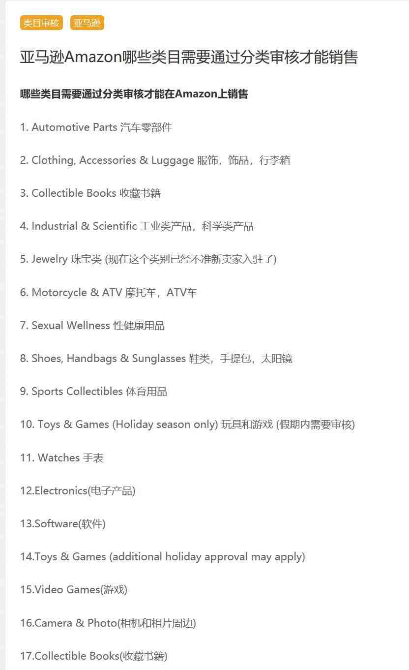 亚马逊有些类目不对第三方卖家开放,有些类目不对美国本土以外的卖家开放,还有些类目属于半开放式,即你如果想卖也可以,但是必须先通过亚马逊的类目审核。