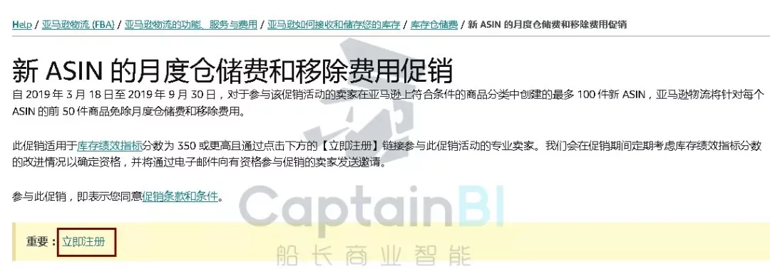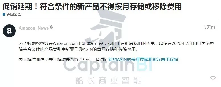(图源亚马逊帮助页面) 不过,船长BI获悉,亚马逊美国站在上周发布公告表示,为了鼓励卖家继续在亚马逊平台上测试新商品,原本定于 9 月 30 日结束的免月度仓储费和移除费促销活动将延长至明年的 2 月 18 日。 (图源亚马逊卖家论坛) 也就是说,接下来,卖家将有更长时间享受这项的福利政策。还没了解卖家趁此机会可以做个详细了解,在一定程度上,能够大大降低自己的运营成本。 该活动面向哪些站点的卖家开放? 船长BI了解到,该活动面向美国站、欧洲站和日本站的卖家开放,但前提是卖家必须满足参与该活动的资格。 哪些卖家可以获得参与该活动的资格? (1)美国站:必须是使用 FBA 的专业销售计划的卖家,并且库存的绩效指标(IPI)需达到 350分 或以上 ,或尚未获得 IPI 分数的专业销售计划的新卖家。 (2)欧洲站和日本站:只要符合专业销售计划的卖家身份即可参与。 参与该活动准入商品的门槛要求有哪些? 船长BI获悉,卖家参与该活动的商品必须符合以下条件: (1)必须是小号标准尺寸和大号标准尺寸的商品; (2)必须是 3 月 18 日之后,及活动开始后创建的新 ASIN。 注意:创建的 ASIN 必须都是新品,且注意在欧洲站,ASIN 必须在欧洲五个站点中都为新品。 哪些分类的商品有资格参与该活动? 据亚马逊官方推送的消息显示,符合要求的商品分类如下: (图源亚马逊全球开店) 如上图所示,适用的商品类目,具体包括: 服装、电器、艺术品、工艺品和缝纫用品、汽车用品、母婴、美容化妆、摄影摄像、手机和配件、收藏品、电脑和视频游戏、电脑、电视/音响、礼品卡、杂货、个护健康、家居和园艺、工业与科学用品、珠宝首饰、乐器、设备和配件、办公用品、庭院、草坪和花园、宠物用品、鞋靴、运动户外、工具和家居装修、玩具和游戏、钟表和酒类。 注意:媒介类商品分类中的 ASIN 和二手商品没有资格参与促销。 如何报名参与该活动? 卖家需完成以下 3 个步骤即可成功参与该活动: 注册 创建ASIN 入库 注意:ASIN 如果有父子变体,父 ASIN 必须是在活动开始之后创建,费用优惠也是基于父 ASIN 进行计算。因此,船长BI建议卖家考虑变体比较少的产品,相对会比较有利,这样对于每个变体能分到的免费名额也多一些。 该活动具体的促销方式是如何运作的? (1)免除月度仓储费 美国站:在 2020 年 2 月 18 日之前,亚马逊将免除每个符合条件 ASIN 的前 50 件商品的月度仓储费。 欧洲站和日本站:在 2019 年 9 月 30 日之前,亚马逊将免除每个符合条件 ASIN 的前 50 件和前 30 件商品的月度仓储费。 (2)免移除费 自 2019 年 7 月 1 日起至活动结束,卖家可以申请从这些商品中移除任意数量,而无需支付亚马逊物流移除费用。 其实,船长BI认为,从这次亚马逊延长活动时间,我们也不难看出亚马逊给卖家提供优惠的只是间接目的,主要目的还是为了平台新品的增长量,以更多的新品来满足不同消费者的需求。对于卖家,可以通过该活动来减少测款的成本,但新品的选择和打造就依旧很重要,如果新品销售起不来同样还是会造成货值的折损的。 (点击查看大图) 卖家们可以借助工具优势,把控好选品工作。通过船长BI的「大数据选品」搜索相关产品的关键词,你可以查看自己所做站点以及相关品类下的商品数据情况。例如:品牌、卖家数、搜索排名、类目排名、月销量预估、reviews数量等,利用这些数据,你可以更好地进行选品调研。 最后,建议卖家把参与亚马逊促销活动省下来的仓储费用于接下来的旺季引流,对于提升销量也是有帮助的。