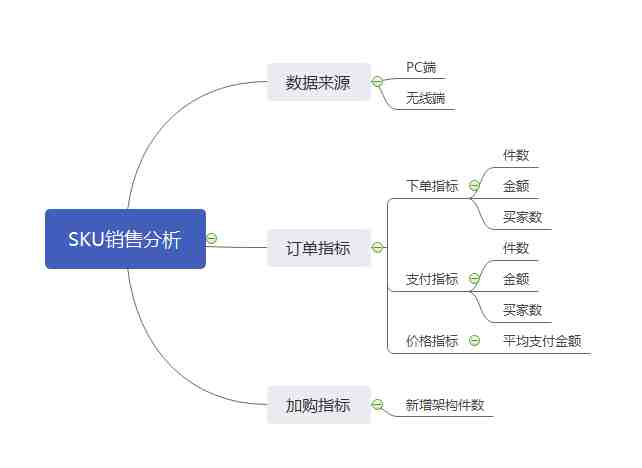 SKU的销售分析结构由三部分组成:数据来源、订单指标和加购指标。在这些结构组成部分来看,从它们显示出来的结果可以看到单个SKU的整体销售情况、价格、颜色及消费者的购买趋向等。