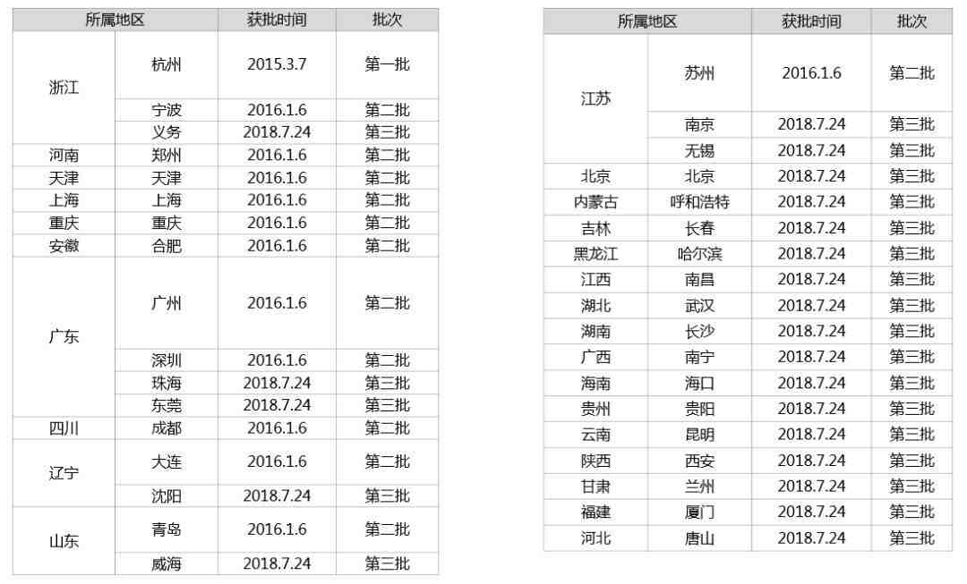 第一批1个:2015年3月7日,国务院关于同意设立中国(杭州)跨境电子商务综合试验区。第二批12个:2016年1月6日,国务院常务会议决定,在天津、上海、重庆、合肥、郑州、广州、成都、大连、宁波、青岛、深圳、苏州这12个城市设第二批跨境电子商务综合试验区。第三批22个:2018年7月24日,国务院同意在北京市、呼和浩特市、沈阳市、长春市、哈尔滨市、南京市、南昌市、武汉市、长沙市、南宁市、海口市、贵阳市、昆明市、西安市、兰州市、厦门市、唐山市、无锡市、威海市、珠海市、东莞市、义乌市等22个城市设立跨境电子商务综合试验区。搭建跨境电子商务通关管理和通关服务平台,实现涵盖企业备案、申报、审单、征税、查验、放行、转关等各个环节的全程通关无纸化作业。报关企业通过平台向海关申报电子清单,同时电商企业、物流企业、支付企业通过平台向海关传输交易、物流、支付电子信息,清单信息和“三单”信息实现对碰。缴纳税款采用网上支付、电子支付的形式。海关审核、查验、放行后将验放指令电子回执反馈报关企业。