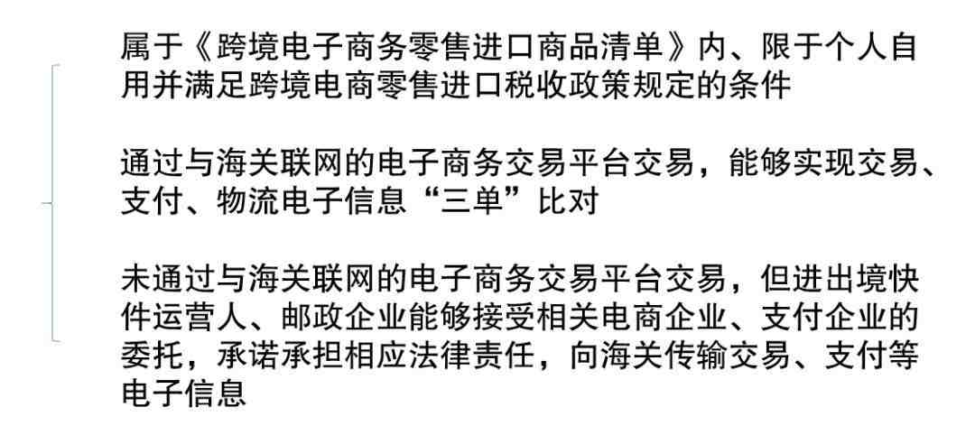 已经购买的电商进口商品属于消费者个人使用的最终商品,不得进入国内市场再次销售;原则上不允许网购保税进口商品在海关特殊监管区域外开展“网购保税+线下自提”模式。 其他事项继续按照《财政部 海关总署 税务总局关于跨境电子商务零售进口税收政策的通知》(财关税〔2016〕18号)有关规定执行;为适应跨境电商发展,财政部会同有关部门对《跨境电子商务零售进口商品清单》进行了调整,将另行公布。适用范围:跨境电子商务企业、消费者(订购人)通过跨境电子商务交易平台实现零售进出口商品交易,并根据海关要求传输相关交易电子数据的,按照本公告接受海关监管。跨境电商零售进口定义:指中国境内消费者通过跨境电商第三方平台经营者自境外购买商品,并通过“网购保税进口”(海关监管方式代码1210)或“直购进口”(海关监管方式代码9610)运递进境的消费行为。 | |