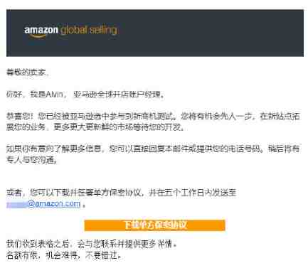 恭喜您!您已经被亚马逊选中参与到新商机测试。您将有机会先人一步,在新站点扩展您的业务,更多更大更新鲜的市场等待您的开发。