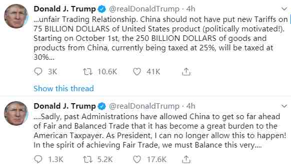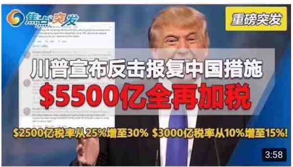 面对美股的暴跌,特朗普总统发推特表示将反击报复中国措施,将对5500亿美元的中国商品全加关税,2500亿美元的关税税率从25%增至30%,3000亿美元的关税税率从10%增至15%。