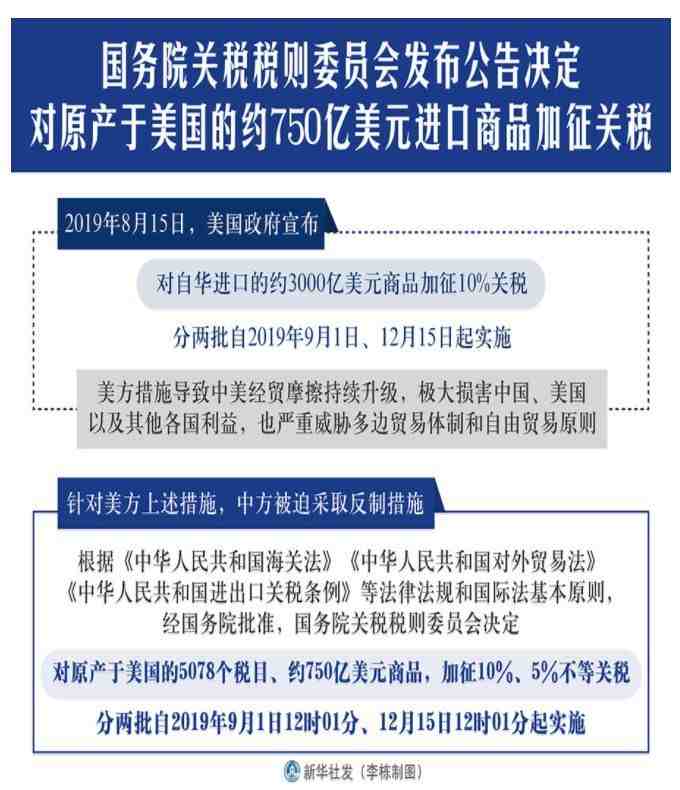 对原产于美国的5078个税目、约750亿美元商品,加征10%、5%不等关税,分两批自2019年9月1日12时01分、12月15日12时01分起实施。