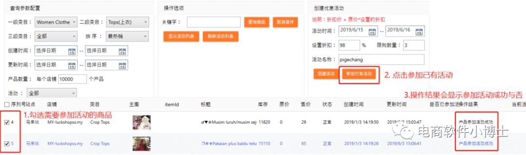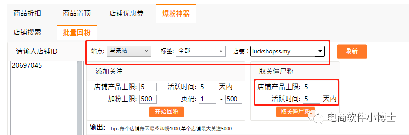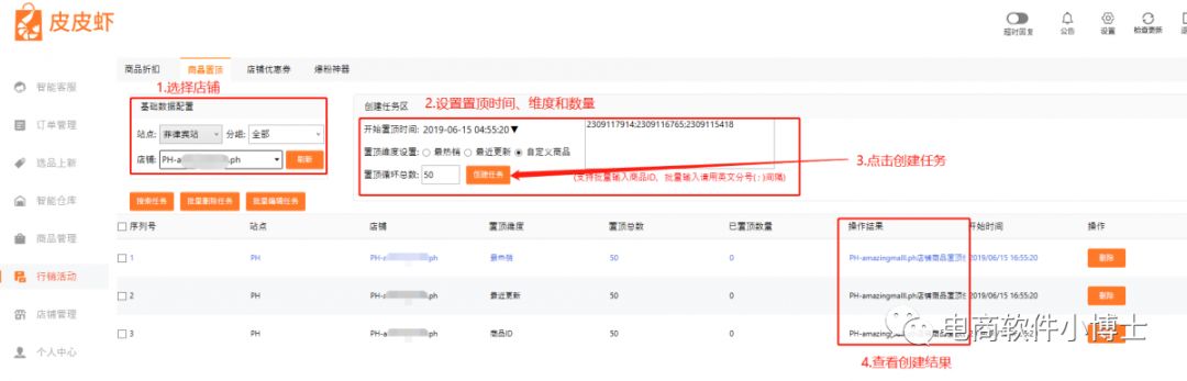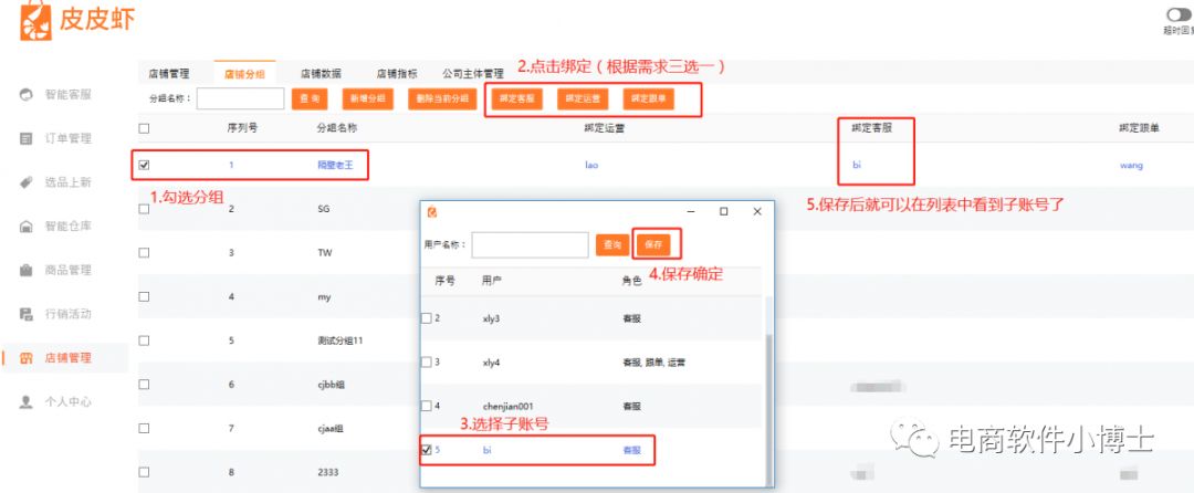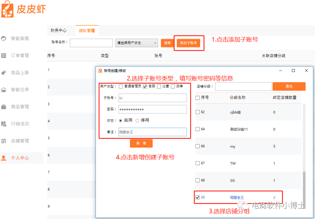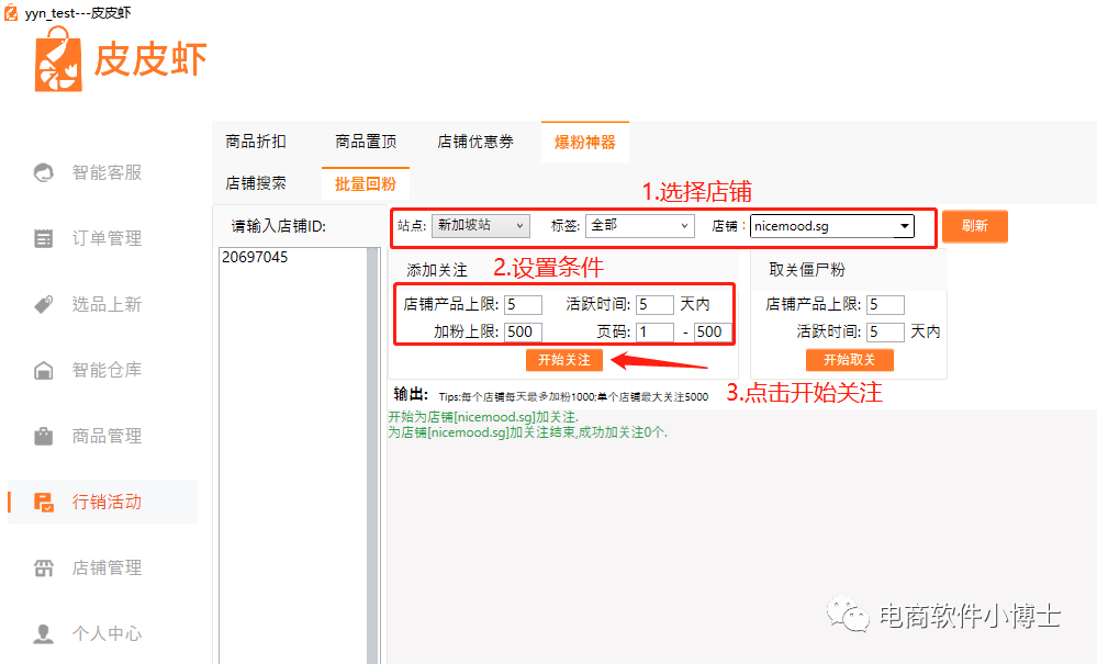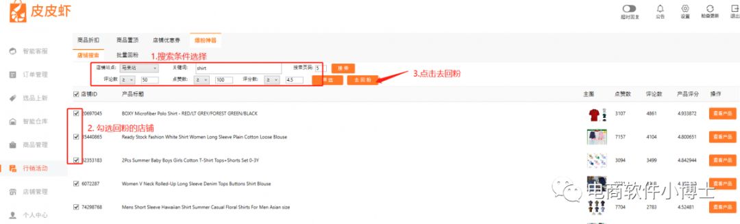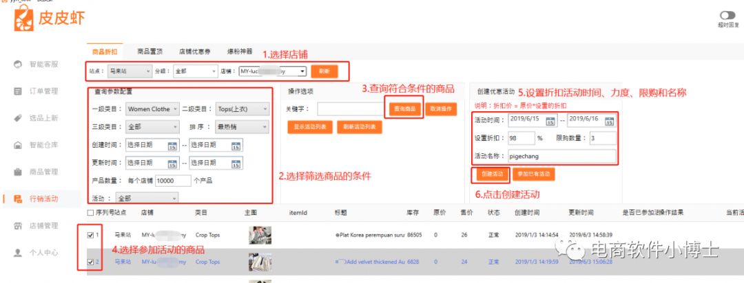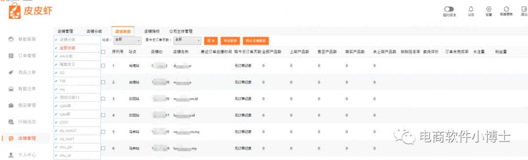 1.1 删除店铺 选择要删除的店铺,点击【一键解绑店铺】,即可删除所选店铺。 1.2 修改店铺登陆密码 ①选择店铺后,点击【修改账号登录密码】,弹出导入新店铺的对话框; ②下载模板,填写完成,保存后关闭表格;样例如下: ③点击【批量导入】导入店铺信息,导入成功点击【关闭】。 1.3 设置退货地址 选中店铺,点击【设置退货地址】,弹出新增地址对话框,按需求填写保存即可。 注意: ①这里的退货地址是指从买家退货,如果您使用的是皮皮虾仓库,那么退货地址应为您的个人地址;如果您使用的是自有仓库,退货地址可以填自己的仓库地址,也可以填个人地址。 ②设置好的退货地址可以在“商家后台-商店设定-我的地址”查看和删除。 ③预设地址是默认地址,设为买家地址(buyer return address)是在虾皮购买商品时的收货地址,设为卖家地址(seller return address)是SHOPEE买家的退货地址。 2.1 批量操作 可以在商品管理-批量操作处对商品进行删除、上下架以及更新库存/价格/天数。流程如图: 还可以右击商品列表栏,对商品进行置顶推广和修改上家地址。 2.2 查询商品 商品管理-货源查找处可以查到商品的链接和上家链接。 3.1 商品折扣 设置的折扣活动可以在“智能客服-商家后台-我的行销活动-我的折扣活动”查看。 1. 创建折扣活动 创建折扣活动流程如下: 点击【显示活动列表】可以看到刚刚创建的活动,此时【显示活动列表】变为【隐藏活动列表】,如果活动没有出现在列表中,可以【刷新活动列表】。 2. 参加已有活动 流程如下: 3.2 商品置顶 流程如下: 注意:置顶循环总数是指最热销或最近更新的商品选50个出来轮流置顶。每次可以置顶5个商品,每个商品4小时。 3.3 优惠券 刷新优惠券列表可看到所有优惠券信息。创建优惠券流程如图: 例:一件连衣裙,原价100,折扣折数设置2%,则售价为,100*98%=98。 创建好的优惠券可以在智能客服-商家后台处查看。 3.4 爆粉神器 爆粉神器的原理是,通过搜索爆款商品找到对应的店铺,关注该店铺的粉丝就有可能得到这些粉丝的回粉。 1.搜索店铺 流程如图: 注意: ①除了店铺站点以外,所有的条件都是用来搜索商品的。 ②关键词是指商品标题中的关键词,如shirt(衬衫)、2019等;台湾站关键词搜索用繁体,其他站点用英文。 ③评论数/点赞数/评分数都是指的商品。 ④如图中所设条件,意为:搜索马来站点中,产品标题有shirt的评论数50+,点赞数100+,评分数4.5+的商品。 2. 回粉 回粉流程: 注意: ①店铺产品上限是指该粉丝的店铺拥有的产品数量不超过多少,(SHOPEE用户可以在平台买东西和卖东西); ②活跃时间是指该粉丝在多少天内浏览过该店铺; ③加粉上限是指最多关注该店铺多少个粉丝; ④页码是指在该店铺的粉丝列表多少页之内进行筛选; ⑤如图条件意为:为新加坡的nicemood店铺(自己的店铺)关注20697045店铺的粉丝,筛选20697045店铺5天内浏览过20697045店铺,店铺产品5个以下的500个粉丝,这些粉丝在20697045店铺粉丝列表1-500页内搜索。 3. 取关僵尸粉 选择好店铺,填好取关条件,点击取关僵尸粉开始取关。 注意: ①店铺产品上限是指粉丝店铺的产品最多有几个; ②活跃时间是指粉丝多少天内浏览过店铺; ③如图条件意为:取关店铺产品5个以上,5天以上没有浏览过店铺的粉丝。 4.1 店铺分组 在店铺管理-店铺分组模块给店铺分组 填写分组名称,根据站点选择店铺,【新增】。相当于之前的“标签”功能。 4.2 添加子账户 添加子账号需要在个人中心-团队管理处添加。 主账号可添加子账号,子账号类型有4种:普通管理员、客服、上货和采购,不同类型的子账号权限不同。子账号具体权限如下: ①普通管理员子账号拥有全部权限(新增子账号除外),能使用所有菜单; ②运营子账号可使用菜单有选品上新、商品管理、行销活动和店铺管理4种; ③跟单子账号能使用的菜单有订单管理、智能仓库和店铺管理3种; ④客服子账号能使用的菜单有智能客服、店铺管理和商品管理3种。 添加子账号流程如图: 子账号点击个人中心-团队管理列表右侧可进行修改。 4.3 绑定运营/客服/跟单 可以用2种方式绑定客服/运营/跟单。 ①店铺管理-店铺分组处绑定。流程如下: ②添加子账号的过程就是绑定的过程。可参考4.2。 5.1 店铺销售数据 店铺销售数据可以在“智能客服-商家后台-我的数据”里面查看仪表板。 1. 关键指标 仪表板里面可以查看6个关键指标:销售额、访客浏览数、订单量、转化率、客单价(每个订单销售额)和商品浏览数。 可以任选2-4个以图表的形式显示,更加直观,便于理解。 2. 商品排名和分类排名 可以根据商品排名和分类排名对店铺商品进行优化,排名靠前的商品多做推广,打造成爆款;分类靠前的类目多上架一些商品。 3. 商品 商品页面有更多维度来分析商品情况,后续皮皮虾也会出一些教程,帮助大家通过数据优化商品,提高单量。敬请期待! 5.2 店铺产品数据 产品上架、下架、售空、禁卖等这些数据可以在“店铺管理-店铺数据”查看。还可以查看聊天回复率、卖场评价等,从这些数据可以知道哪里做的不好,作出改进。 5.3 店铺指标数据 店铺指标主要是订单完成、物流服务、买家满意度、违反上架、店铺评分等级等几个指标数据。 可以根据这个指标适度调整精力分配。比如说,这个月订单完成度比较低,说明订单出问题比较多,下个月就把更多的精