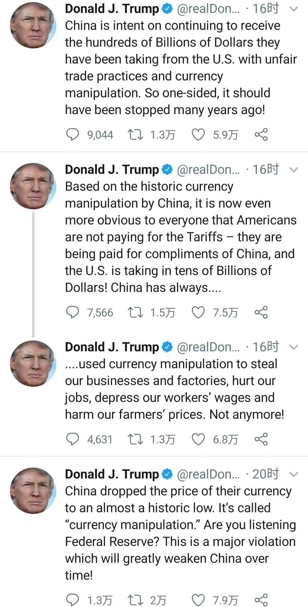 推文大意为:“中国将其货币价格降至历史最低点,用削弱自己(汇率)的方式达到平衡关税的目的,美国将要花费数百亿美元来自己支付。中国历史性地一贯使用“操纵汇率”来损害我们企业和农民的利益,这种单边主义贸易伤害,很早就应该被阻止了。美联储你在听吗?”