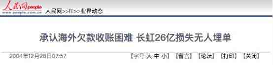 2004年,长虹年报显示一次性计提亏损超过30亿元。从长虹2002-2005年的财报看出,应收APEX公司的销售余款占当年海外销售额的比例从最初的69.1%在三年内上升到133.65%。巨额的应收账款大幅度减少了长虹的现金流量净额,从1999年的30亿元急剧下降到2002年的-30亿元,给公司经营造成极其恶劣的影响。时至今日,长虹在北美交的学费仍然是应收账款管理中的著名反例。
