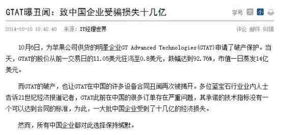 原来,GTAT是苹果的人造蓝宝石屏幕技术服务商,利用信息不对称,忽悠很多中国企业采购其并不成熟的屏幕生产设备,甚至投资建厂,投入大量资金。