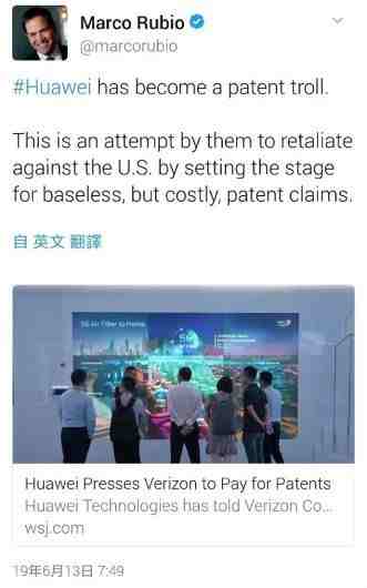 在《华为是“专利流氓”?美国参议员急了》(后台回复关键词“卢比奥”,获取文章)一文,我介绍了华为要求Verizon支付10亿美元的专利费,美国参议员马可·卢比奥跳出来,倒打一耙指责华为是“专利流氓”。