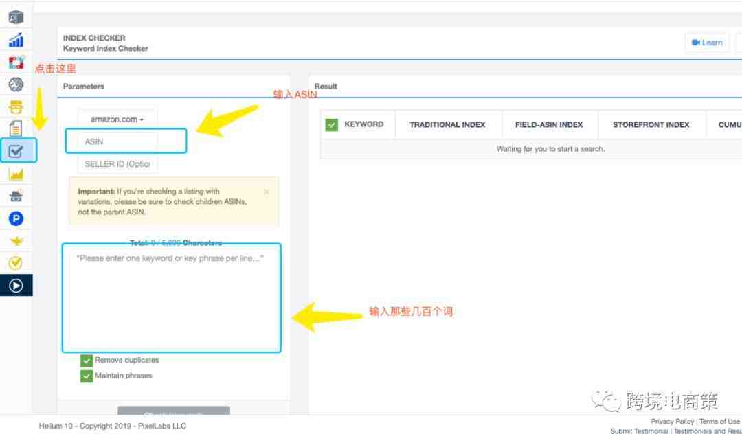文章最后我给大家推荐这个helium10的另一个非常好的功能就是,你埋了很多词之后你可以查找亚马逊有没有收录你的这些关键词,你可以用这个功能