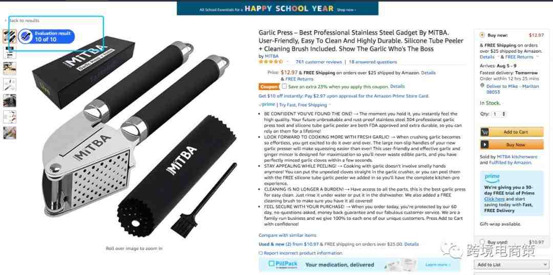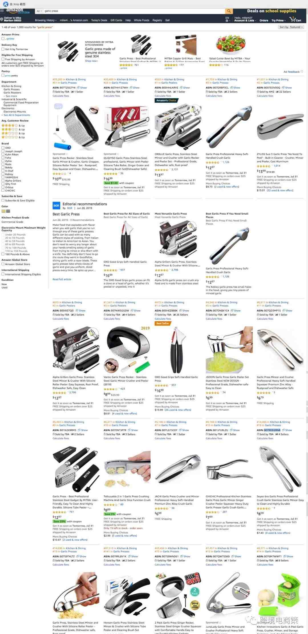 举个例子,比如说打算卖压蒜器,garlic press ,那我得如何去写这个listing?埋哪些词呢?我们在亚马逊上看看 我们输入garlic press出现哪些listing