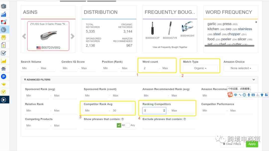 4.Ranking competitors :某一个词同时被几个卖家ranking,你给它先定一个最少三个卖家同时在抢某个词的30以内的排名位置。