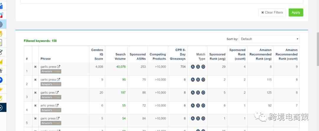 我们设置这些参数之后呢,我们原本得到的1000多个或者2000多个关键词立马缩小到200以内了,这个也要看这个类目,或者某个产品的竞争力度,有时候你的产品竞争非常激烈,而且销售量也非常大,这个时候你用这种方法得到的数据可能更多,这个时候数据还得二次筛选,你设定条件之后呢 ,你点选apply,你会看到,这样的画面: