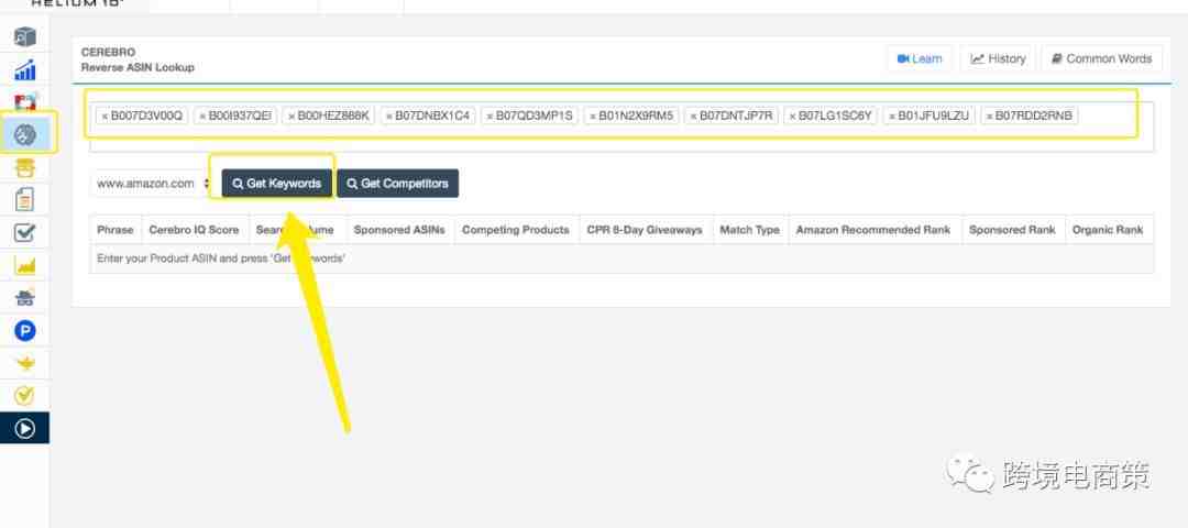 我不建议 你去卖这个 ,我只是把这个产品作为案例给你们讲,其实客户输入关键词之后 找到产品 之后很少购买到排到第三页后面的产品,别说第三页 ,自然位排到第一页靠后的位置的销量页不是很多,所以我们这个时候筛选出10个asin 和我们的产品高速相似的,自然排名高的,然后做下一个动作,我在自己的公众号多次提到过Helium10 Cerbero 功能,今天我们找词也是用这个功能,请看下图:
