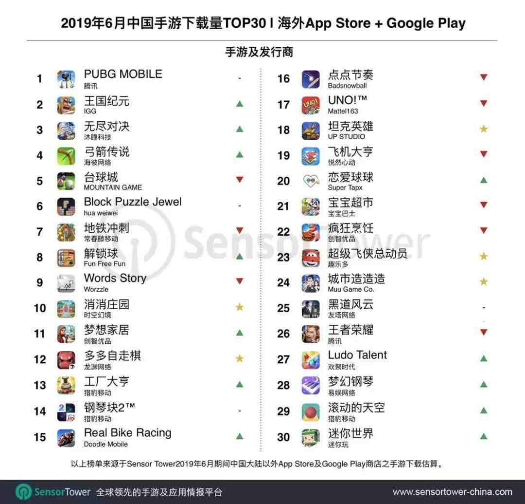 Sensor Tower 发布 2019 年 6 月期间中国手游产品在海外市场下载量排名 TOP30 榜单。本月龙渊网络《多多自走棋》,《英雄坦克》,《超级飞侠总动员》,《城市造造造》等 5 款游戏首次入围榜单。