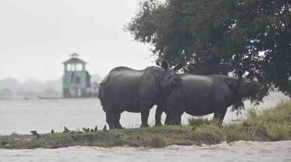 随着公园水位越来越高,犀牛、野生水牛、老虎和大象也纷纷加入动物迁移的大军中。