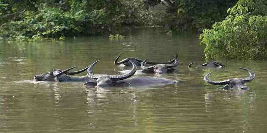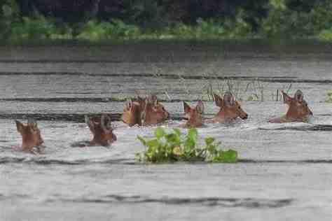 野牛在洪水中奔跑,独角犀牛在被水围困的高地中央,结队的大象横穿马路,出逃的老虎躲进了商店、惊恐的鹿群在洪水中挣扎……