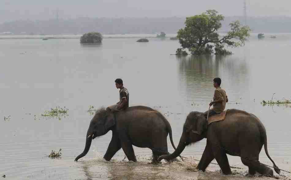在洪水泛滥的印度阿萨姆邦野生动物保护区,象夫们骑着大象进行巡逻。