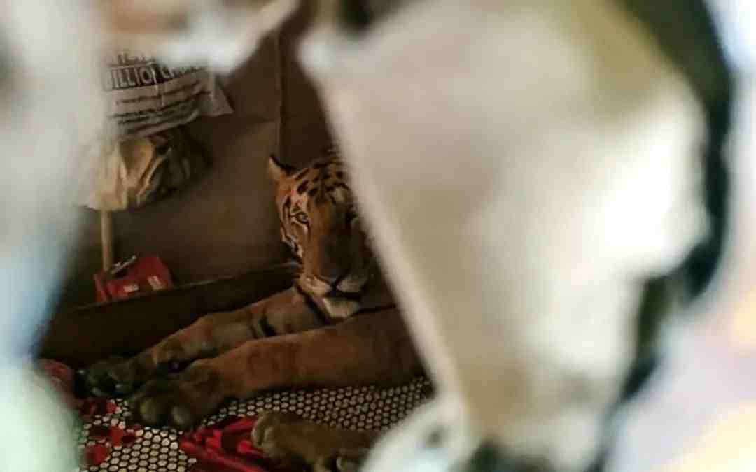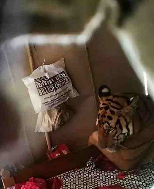 当地兽医乔杜里称:“店主早上8:30正准备要开门营业,他看到老虎跳了进来。店里的一扇门开着,里面很黑。老虎正坐在商店里的一张床上。”