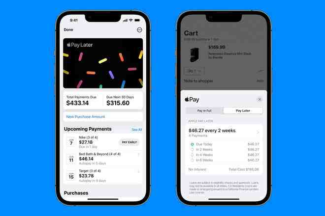 先说一下苹果新推出的先买后付功能 Apple Pay Later。根据 The Verge 的报道,Apple Pay Later 将会面向美国的 iPhone 和 Mac 用户推出,用户可以通过 Apple Pay Later 在六周之内免息分期 4 期购物。这项服务将基于 Apple Pay 支付,在使用 Apple Pay 付款时,除了“全额付款”选项之外,还会增加一个“后付”的选项,用户可以在任何线上和线下支持 Apple Pay 的商店使用 Apple Pay Later。