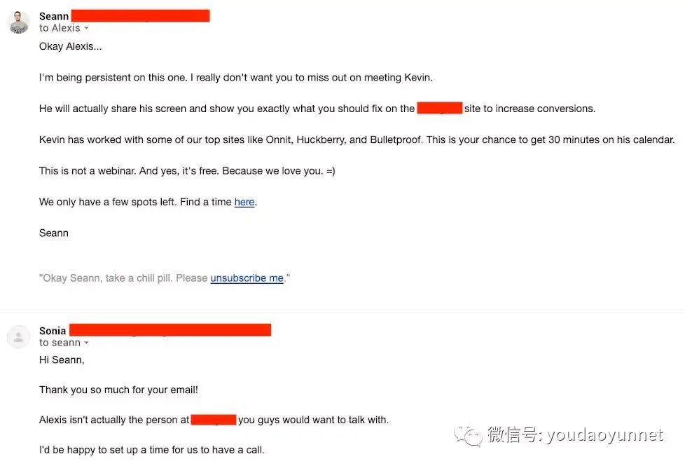 为什么这样做有效果:首先,你要给潜在客户一个理由,让他们知道你为什么有点急躁(也就是说,你保存了对方的收件箱)。这封邮件没有永远等待回复的意思,而是直奔主题。如果你的潜在客户感兴趣,他们可以直接预订时间;如果没有,你可以节省时间。