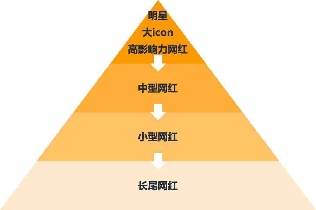 按照KOL的营销影响力和对应人数,我们可以用“金字塔”模型对该群体进行等级分类。首先“金字塔”的最顶端是极少数的明星、大icon以及高影响力的网红;第二层、第三层分别为中型网红、小型网红;而“金字塔”的底端则是数量较多的长尾网红。