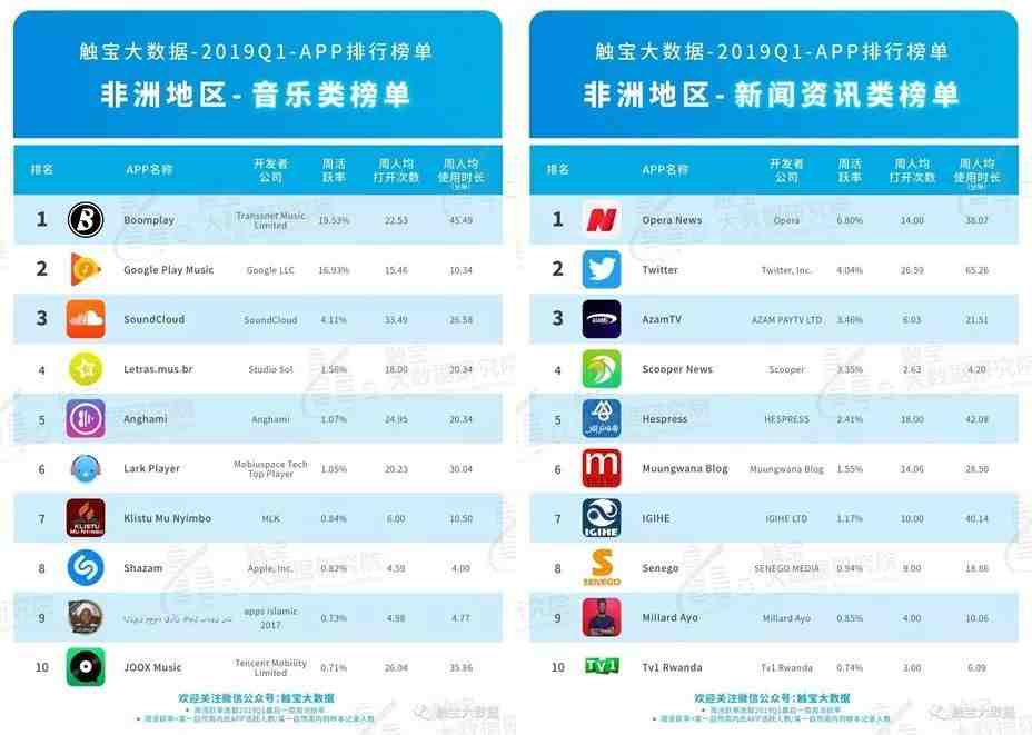 根据“触宝大数据-2019Q1-APP 排行榜单”的非洲地区音乐类榜单,Boomplay 传易音乐排第一。Boomplay 其实做的更多的是本地化内容,而不是欧美的内容,因而很快就超过了 Google Play Music,位居第一。排名第五的 Anghami 是阿拉伯文化圈的一个流媒体音乐平台,因为北非其实有很多阿拉伯人,所以它在非洲的 APP 排名也上升很快。要想脱颖而出快速增长,需要挖掘更多本地化的与欧美文化惯性不一样的内容。