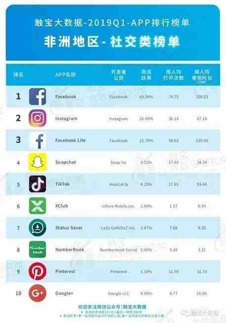 一方面,根据“触宝大数据 2019 年 Q1APP 排行榜”非洲地区社交类榜单显示,排名靠前的是欧美产品,如 Facebook、Instagram 等。这些跨国的产品不需要做任何的工作,因为它们和非洲在文化上有一个相关性,自上而下的打法势能很大。