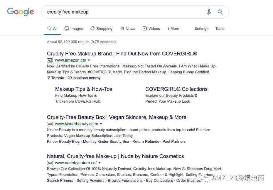 举例来说,将cruelty-free makeup(零残忍化妆品)作为切入点,在谷歌进行搜索,如下图所示,你将会看到许多vegan skincare(纯天然护肤)、not tested on animals(无动物实验)的字眼,你可以由此入手。