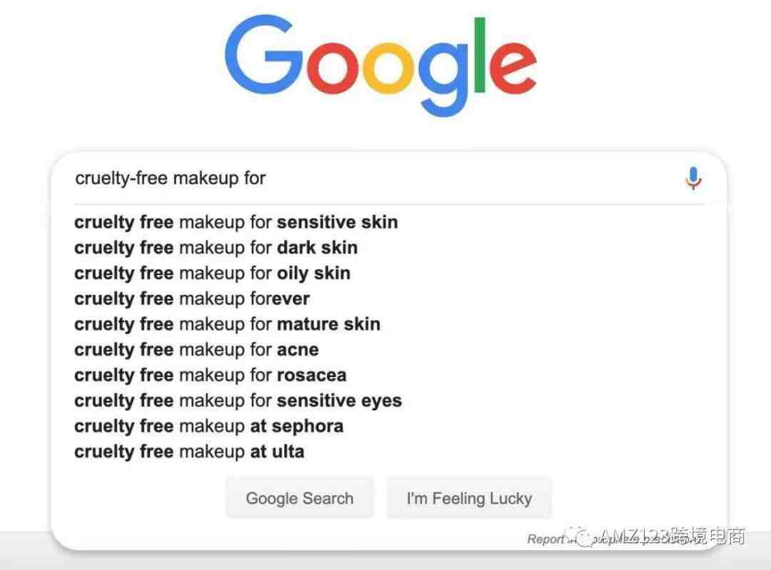 大家都知道,在谷歌搜索框中还没完全输入关键词,底下就会出现自动推荐搜索词。这些是谷歌算法算出的最相关的搜索字词,你可以据此来寻找你的利基品类。