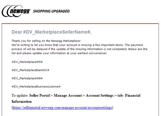 而且如果未通过审核,Newegg系统会自动给商家发送一封提醒邮件,如下,